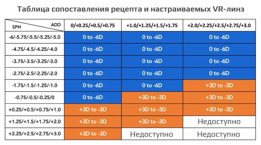 Линзы от 0 до -6D подходят для пользователей с близорукостью до -6D. Линзы от +3D до -3D подходят для пользователей с дальнозоркостью до +3D или близорукостью до -3D.