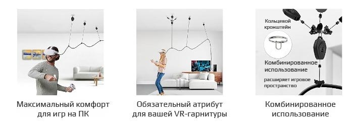 Система совместима с различными гарнитурами виртуальной реальности, такими как Oculus Quest 2, PICO 4, PSVR2, Valve Index и другими, а держатель кабеля гарнитуры из мягкой эластичной резины обеспечивает его защиту.