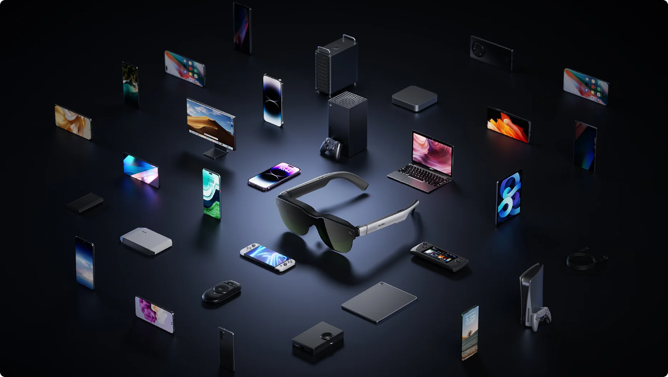 Очки работают с более чем 1000 устройств через USB-C с поддержкой DisplayPort Alt Mode: смартфоны iPhone (с адаптером), Android-устройства, MacBook, PlayStation 5, Xbox и другие платформы. Поддержка HDMI-адаптеров расширяет возможности подключения к игровым консолям и ПК.