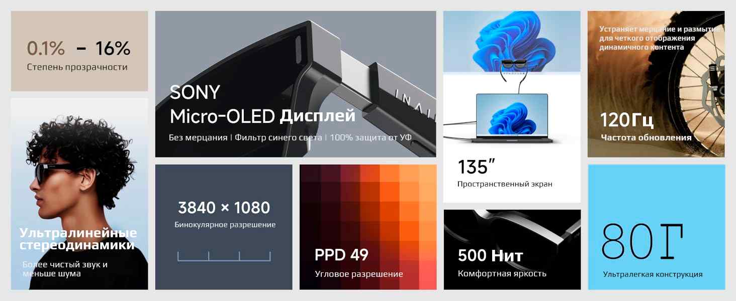 Специальное ПО INAIR Space превращает очки в мощный AR-ассистент для офиса. Через кабель DP к Mac OS или Windows можно получить многоканальное расширение рабочего стола (до четырех экранов), плавное переключение между реальностью и виртуальностью, настройку размера и расстояния виртуальных экранов, а также приватный режим. Поддержка смартфонов пока недоступна.
