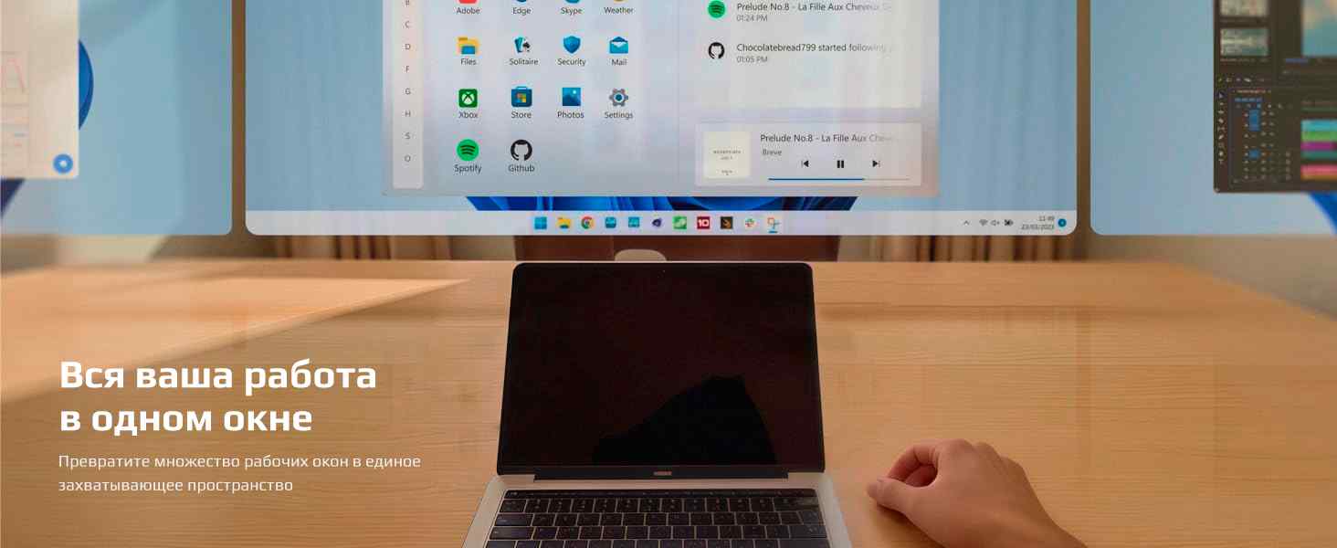 Подключите очки к смартфону, планшету или ноутбуку — и вы получите персональный дисплей с диагональю до 135 дюймов, частотой обновления 120 Гц и ультравысоким разрешением. При работе с Mac OS и Windows открывается возможность многозадачной работы: несколько виртуальных окон, широкоформатный режим и удобная организация рабочего пространства.