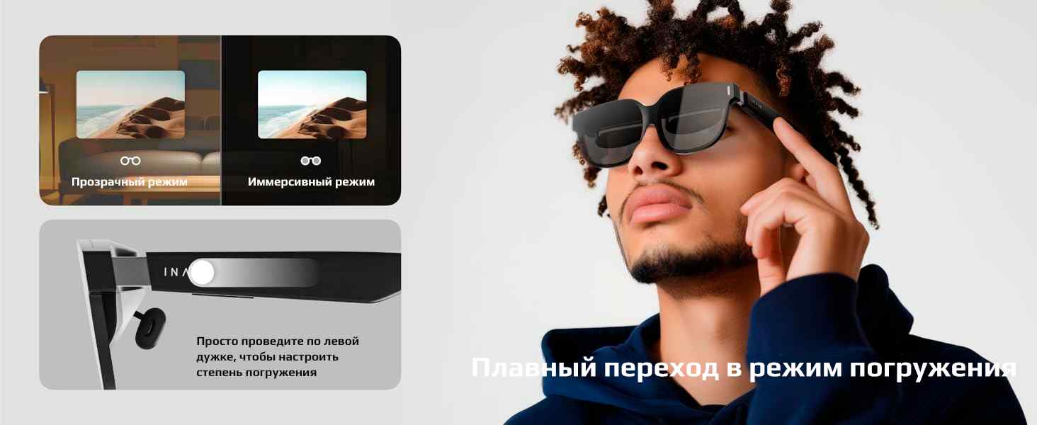 Благодаря технологии электрохромного затемнения можно легко менять степень прозрачности линз одним движением по дужке. Режим погружения блокирует почти весь внешний свет, а прозрачный режим регулирует светопроницаемость от 0,1% до 16% — подстраиваясь под окружающую обстановку. Это позволяет мгновенно переключаться между виртуальной реальностью и реальным миром.
