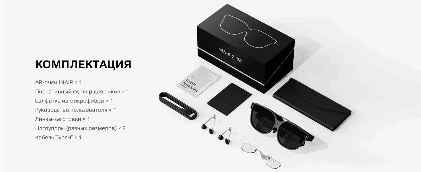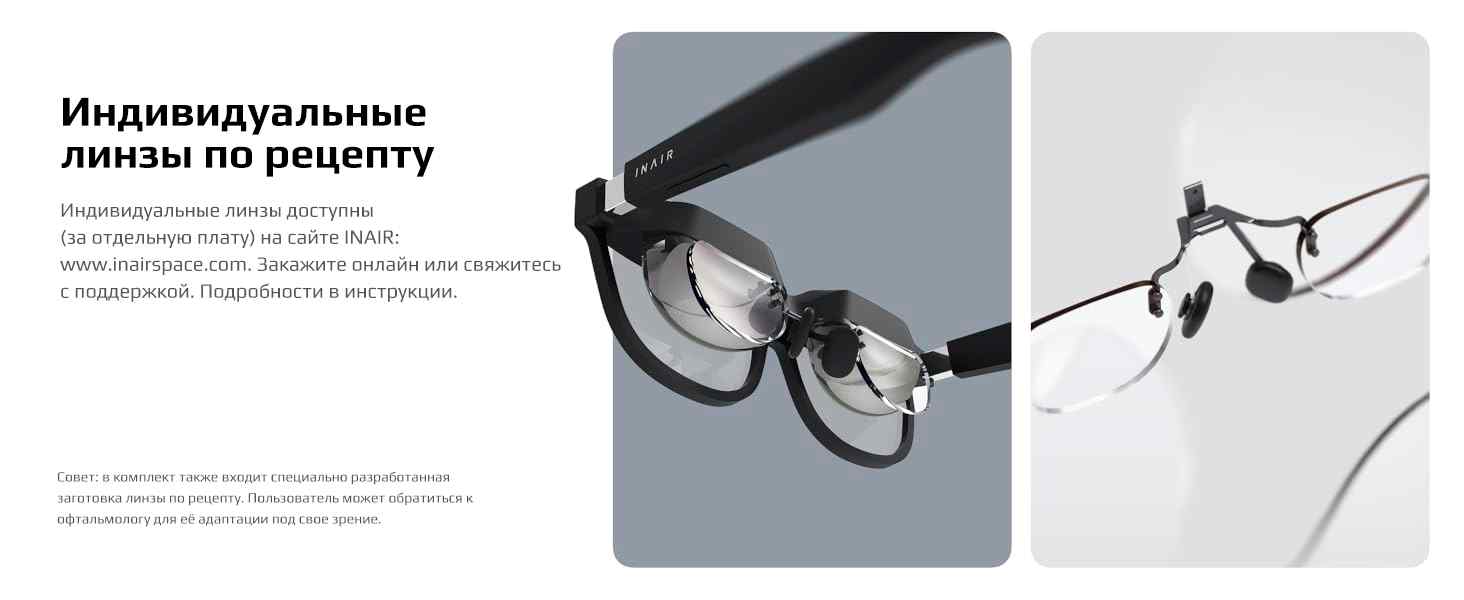 Очки разработаны для работы и не имеют встроенной коррекции зрения. Владельцы миопии, астигматизма и других особенностей могут заказать индивидуальные линзы у официального сервиса INAIR Space, информация о котором указана в инструкции.