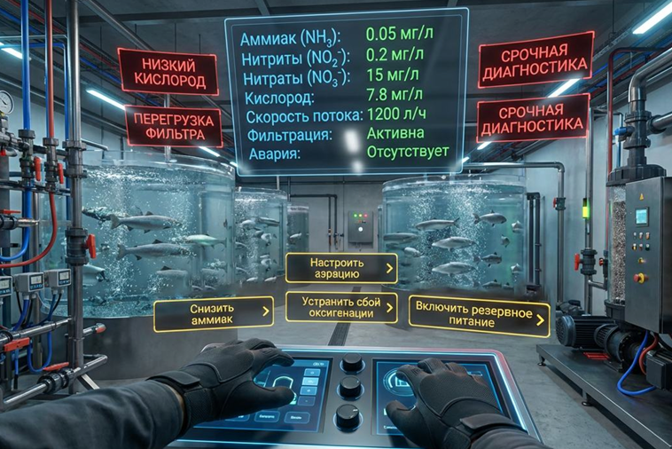 Модуль 1: «Интенсивные системы (RAS): азотный цикл, фильтрация, аварийные режимы» (для 8-11 классов) Глубокое погружение в работу установки замкнутого водоснабжения — высокотехнологичной фермы по выращиванию рыбы. Учащийся управляет биофильтром, контролирует уровень аммиака, нитритов и нитратов, настраивает оксигенацию и отрабатывает действия при сбоях оборудования (например, отключении кислорода). Модуль формирует понимание биохимических процессов в УЗВ и навыков управления сложными технологическими системами.