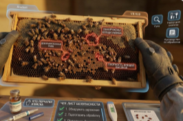 Модуль 1: «Биология пчелиной семьи и осмотр улья» Иммерсивный симулятор, погружающий учащихся в жизнь пчелиной семьи. В виртуальной среде учащийся «надевает» защитный костюм пчеловода, осматривает улей, находит матку, оценивает количество расплода и запасов мёда. Модуль позволяет детально изучить строение пчелиных сот, различать типы ячеек (медовые, расплодные, трутневые), отслеживать развитие пчелиной семьи в различные периоды сезона.