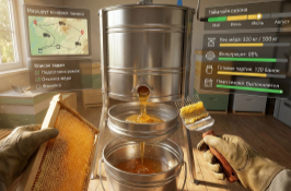 Модуль 3: «Медосбор и логистика пасеки» Комплексный симулятор, моделирующий полный цикл работ на пасеке для получения товарного мёда. Учащийся планирует кочёвку пасеки к медоносам, откачивает мёд на медогонке, проводит его фильтрацию и учитывает товарный выход продукции. Модуль включает экономические расчеты, планирование сезонных работ, учет погодных факторов и медоносной базы.