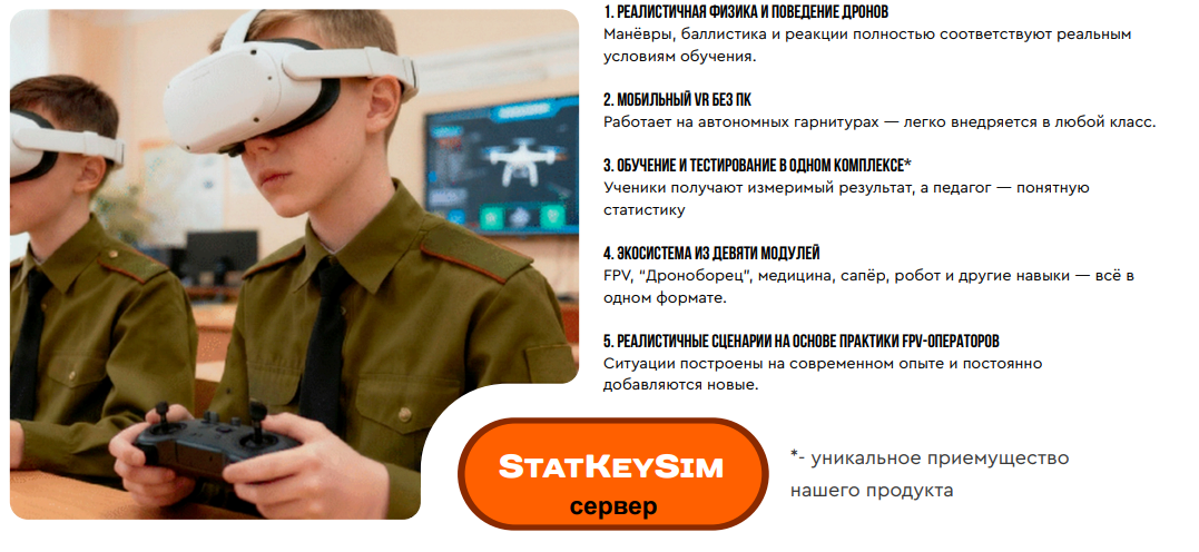 Z-учебка: Дроноборец — это инновационный иммерсивный учебно-тренировочный комплекс виртуальной реальности, разработанный для современной подготовки обучающихся в рамках курса основ безопасности и защиты Родины (ОБЗР). Система представляет собой полностью автономное VR-решение, не требующее подключения к персональному компьютеру, что обеспечивает максимальную мобильность и оперативное развертывание занятий в любых условиях.