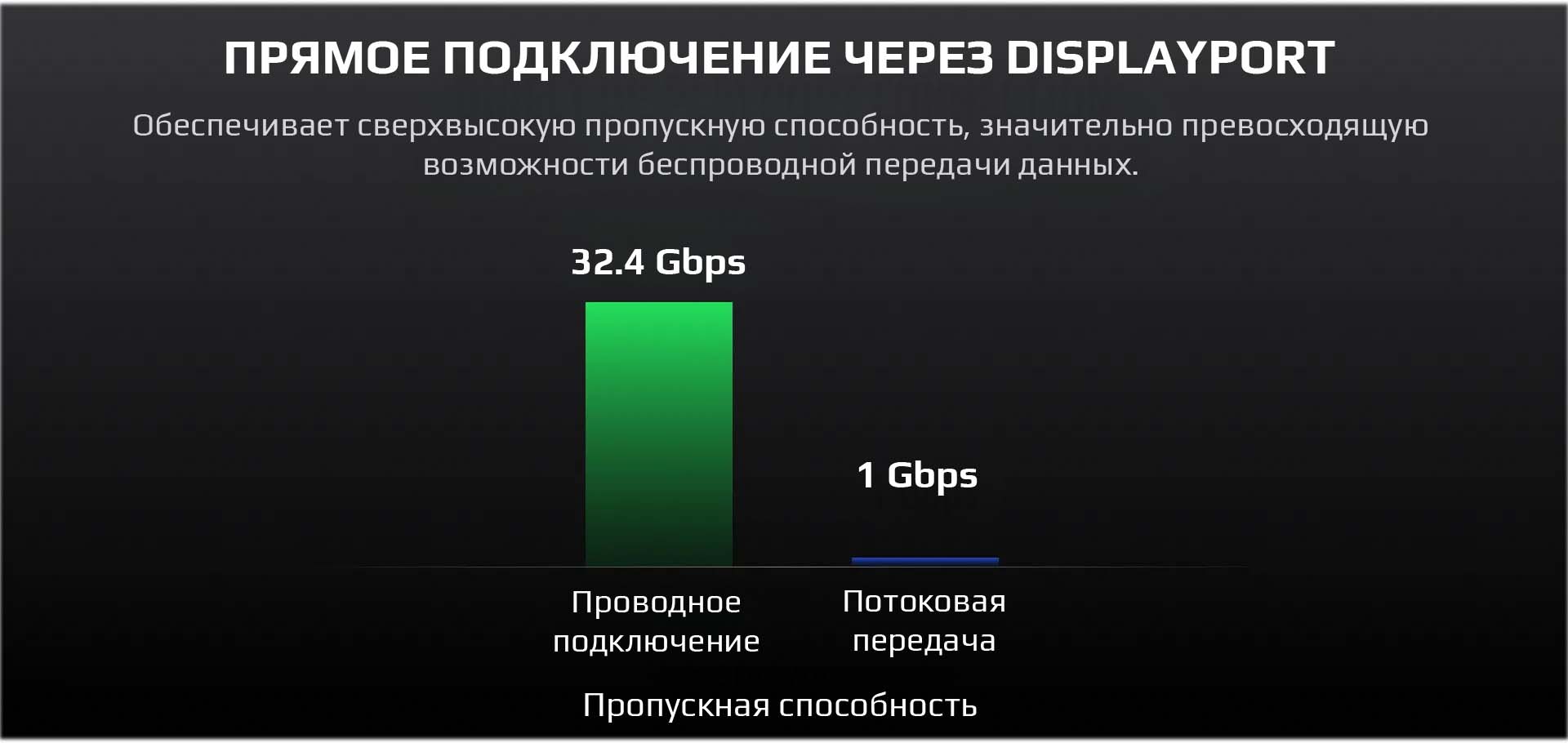 | Подключения | Прямое соединение через DisplayPort Пропускная способность соединения - До 32,4 Гбит/с (DisplayPort) / ~1 Гбит/с (стриминг) |