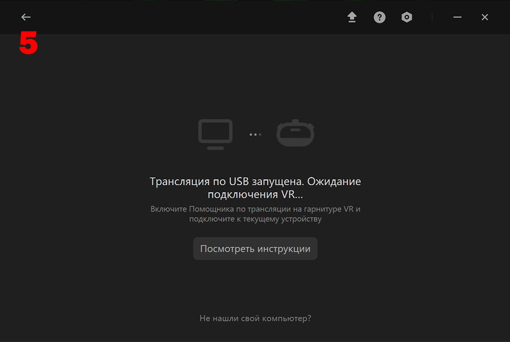 - Выберите подключение по USB и нажмите продолжить (подключите шлем к ПК по USB 3.0, и вы должны будете увидеть окошко, что трансляция запущена);