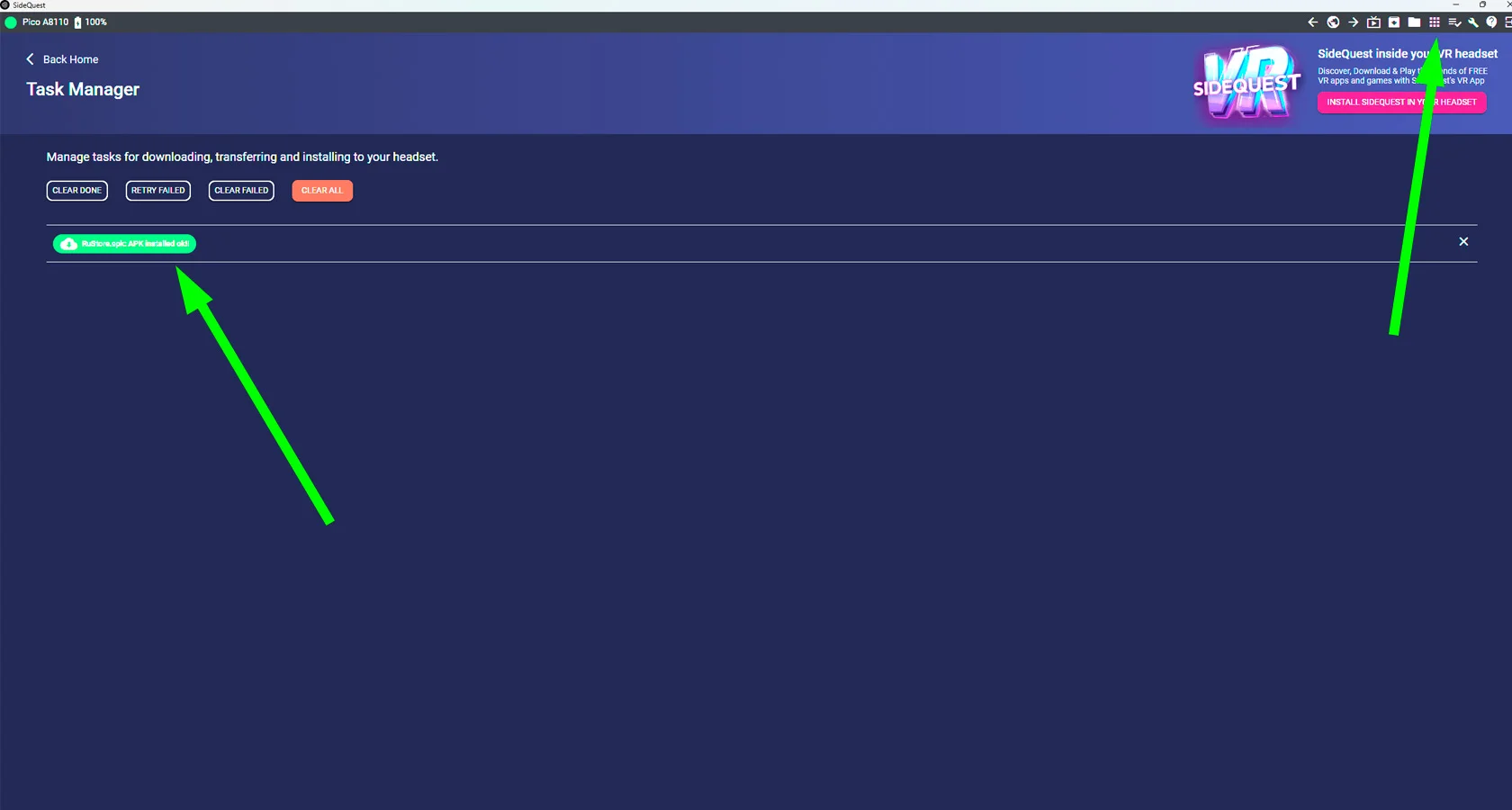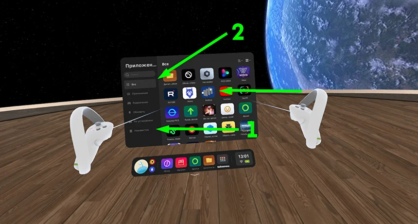 - Необходимо просмотреть перечень доступных на шлеме Pico 4 APK-файлов. Если пользователь предварительно выполнил загрузку файла, то он обязан отобразиться.