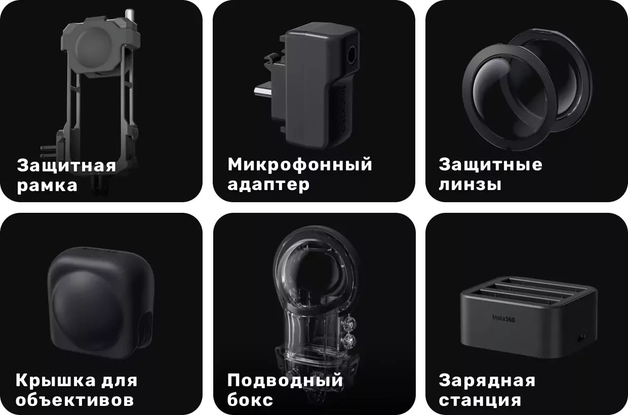 Для расширения функционала камеры Insta360 X3 предусмотрен большой ряд аксессуаров. Среди них есть металлическая рамка для фиксации дополнительных приспособлений, адаптер, которым можно подключить внешние устройства записи звука, защитные стекла для объективов с удобным магнитным креплением. Можно купить зарядную станцию для зарядки одновременно до трех АКБ.