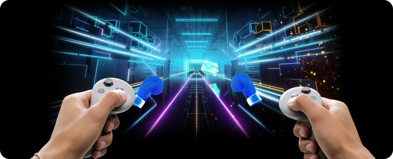 Особое внимание уделено эргономике: контроллеры выполнены в современном безкольцевом дизайне, что делает их компактными и лёгкими в обращении. Регулируемые ремешки надёжно фиксируют устройство на руке, исключая выскальзывание даже во время активных сцен. Все элементы управления расположены так, чтобы пользователь мог дотянуться до них без напряжения — даже при длительном использовании.